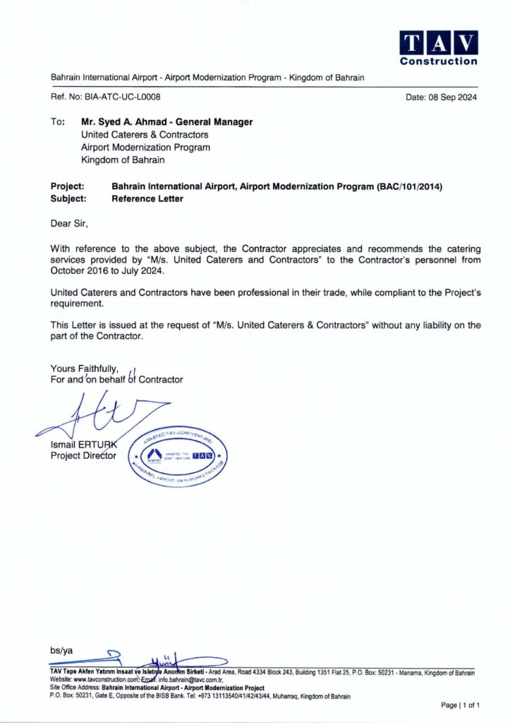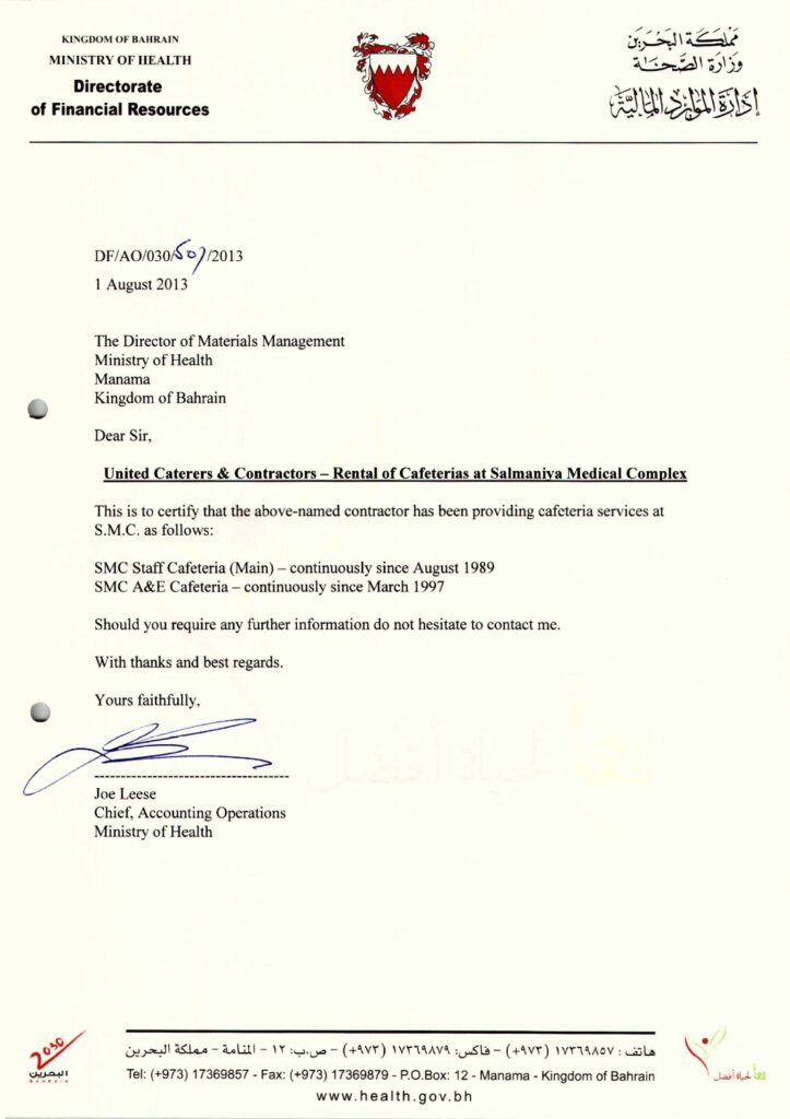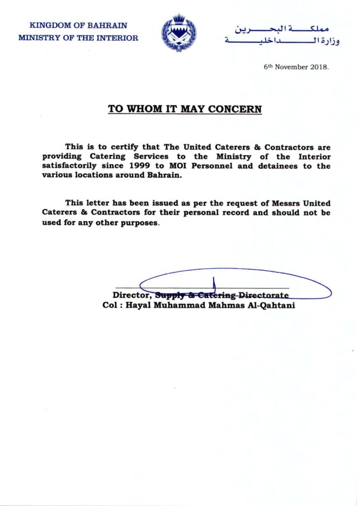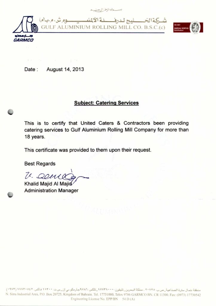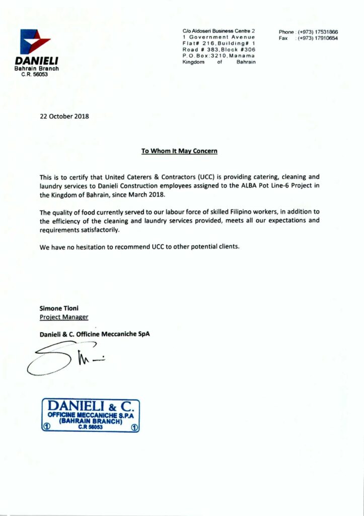 This is to certify that United Caterers & Contractors (UCC) is providing catering, cleaning and laundry services to Daniell Construction employees assigned to the ALBA Pot Line-6 Project in the Kingdom of Bahrain, since March 2018.