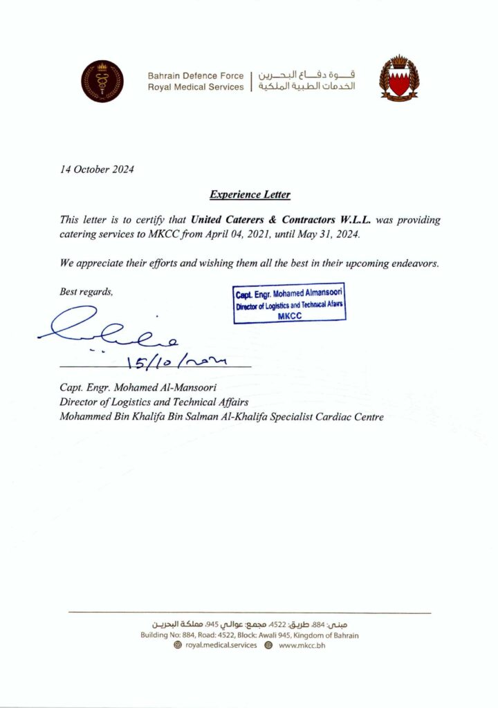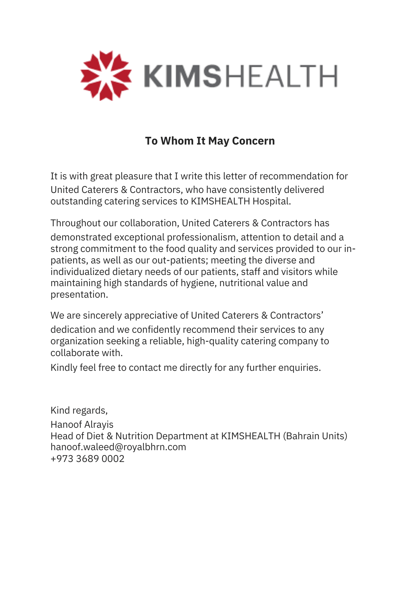 It is with great pleasure that I write this letter of recommendation for United Caterers & Contractors, who have consistently delivered outstanding catering services to KIMSHEALTH Hospital.