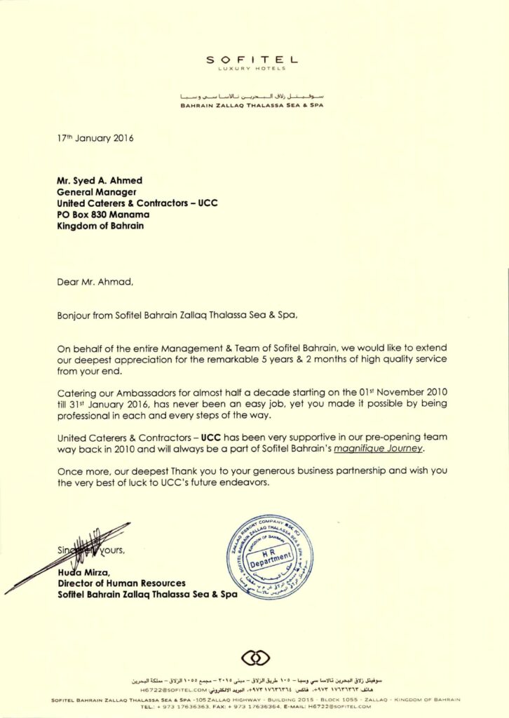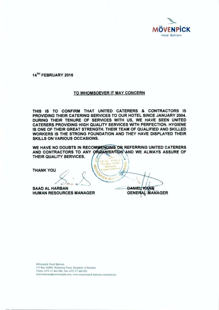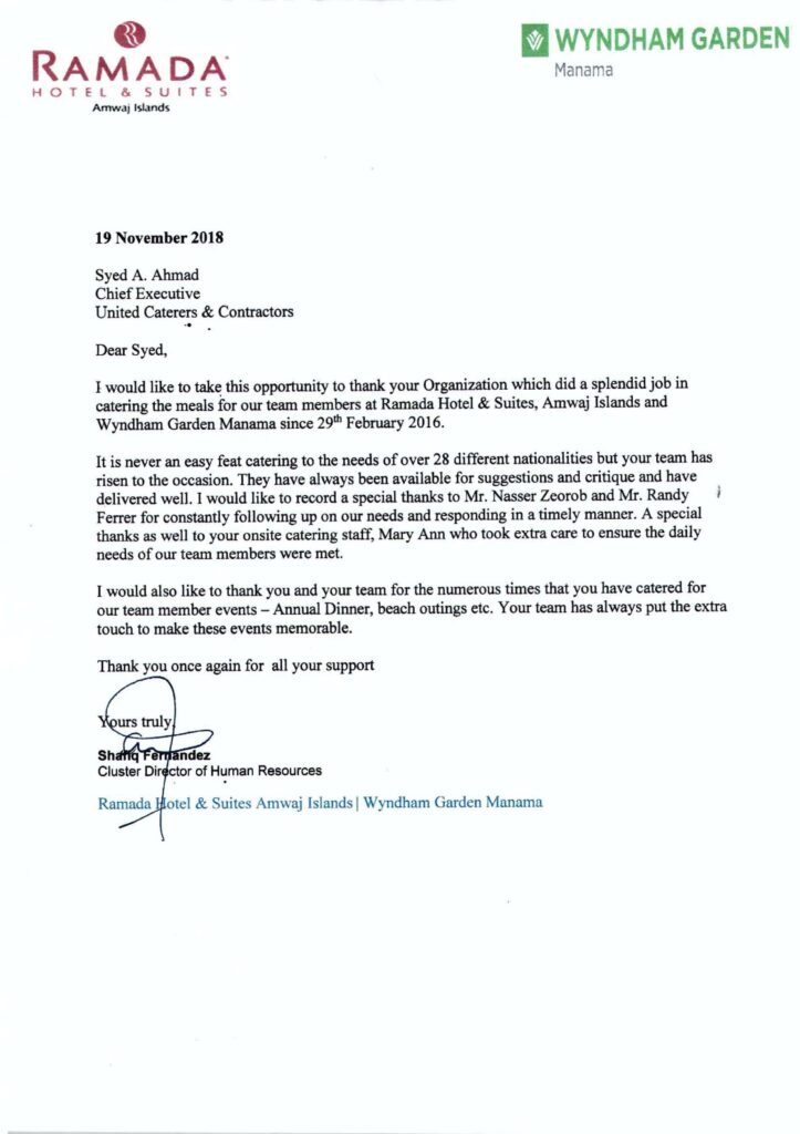 "I would like to take this opportunity to thank your Organization which did a splendid job in catering the meals for our team members at Ramada Hotel & Suites, Amwaj Islands and Wyndham Garden Manama since 29th February 2016.
